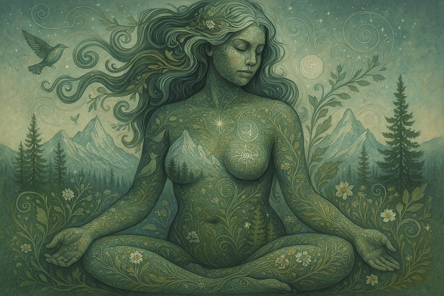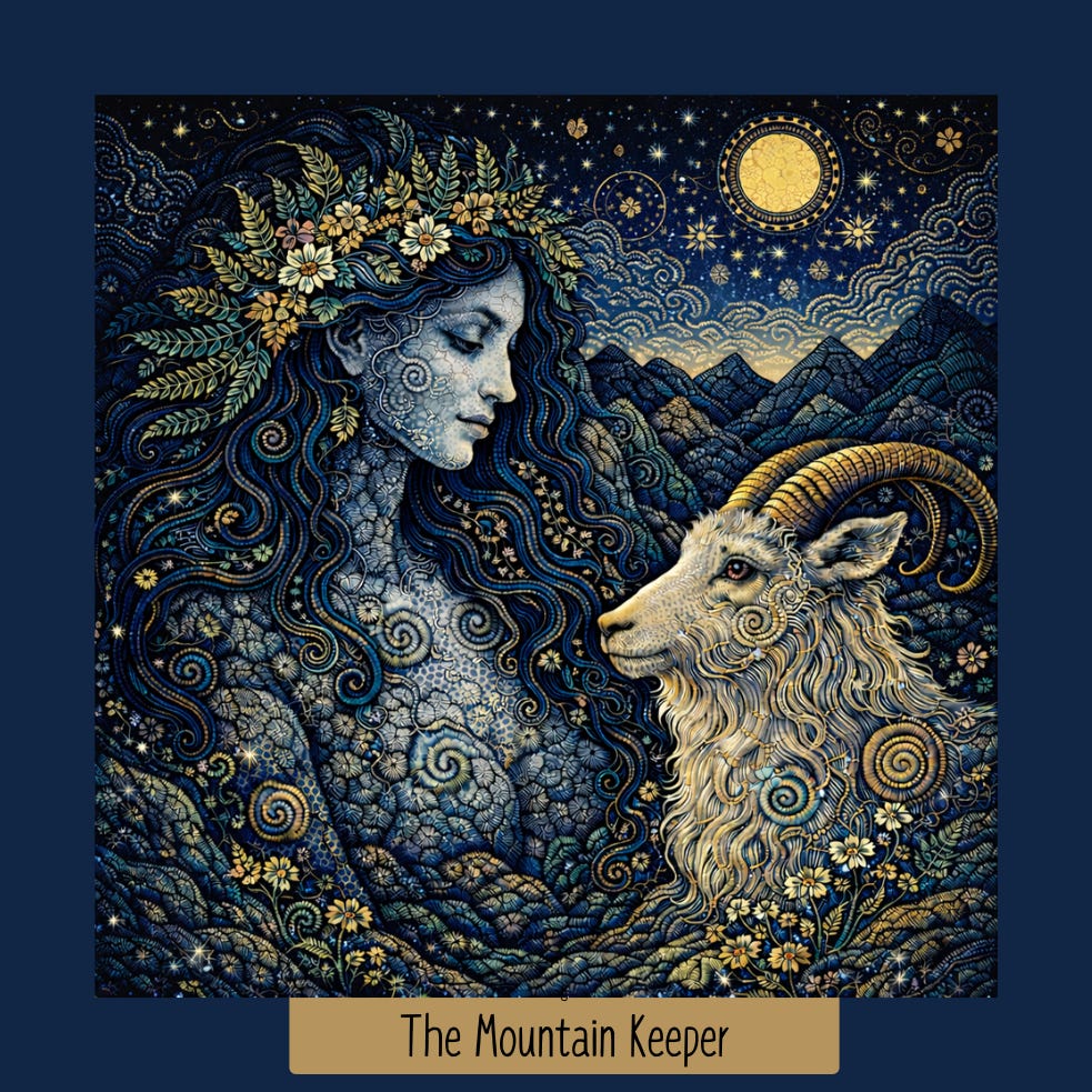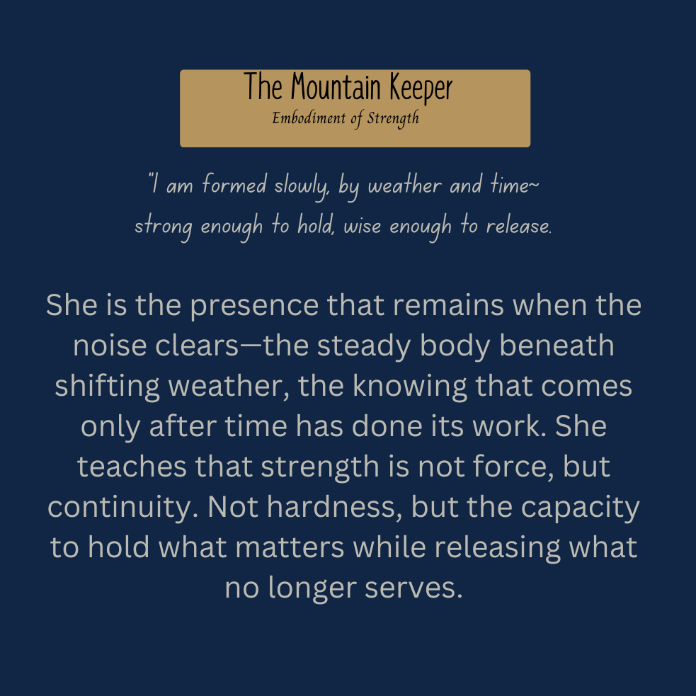 The Mountain Keeper is not separate from the land. She is the land—shaped by pressure, marked by seasons, softened and strengthened by what has passed through her. Her power is quiet and immense, built layer by layer through lived experience.